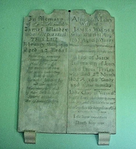 | A memorial to James and Mary now mounted on the wall inside the modern day Baptist Church at Cuckfield. |
