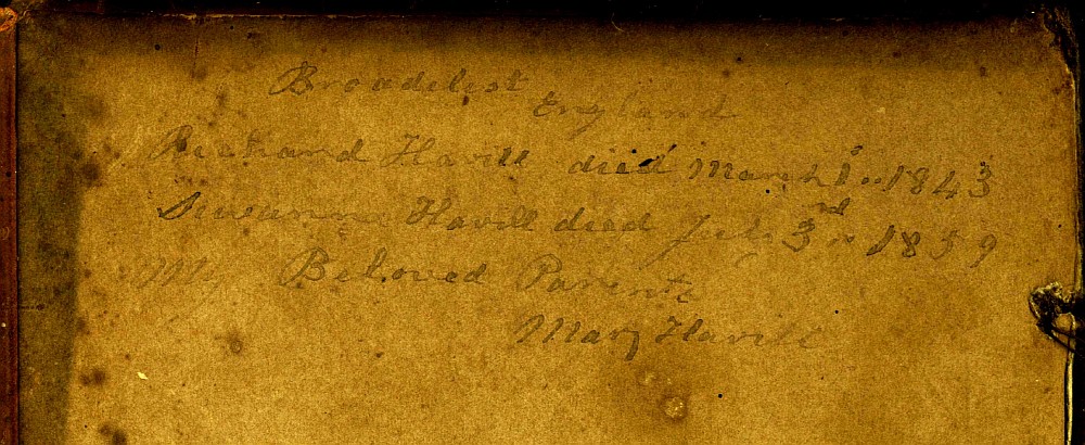 | A dedication to Richard and Susannah by their daughter Mary in her bible |