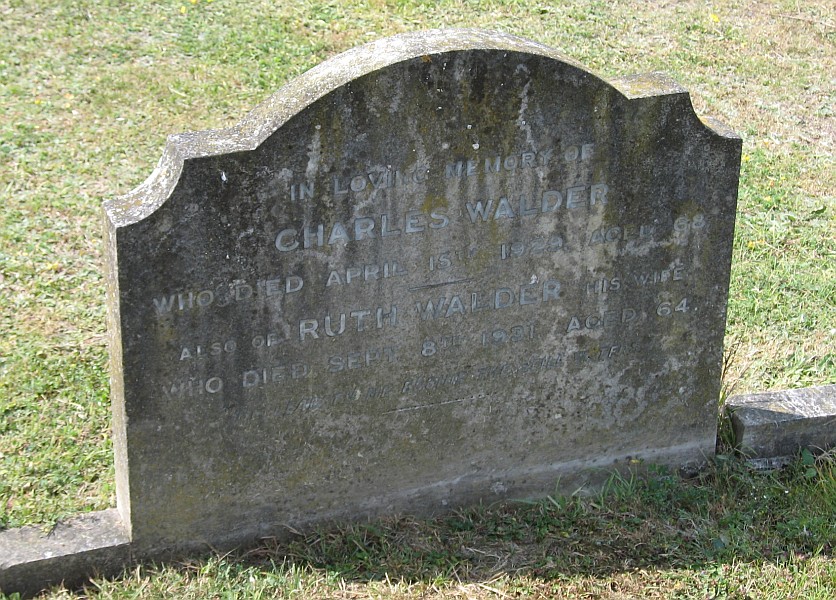 | In loving memory of CHARLES WALDER who died April 15 th 1929 aged 68 also of RUTH WALDER his wife who died Sep 18th 1931 aged 64 |