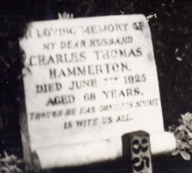 | IN LOVING MEMORY OF MY DEAR HUSBAND CHARLES THOMAS HAMMERTON DIED JUNE ? 1925 AGED 68 YEARS THOUGH HE HAS GONE HIS SPIRIT IS WITH US ALL |