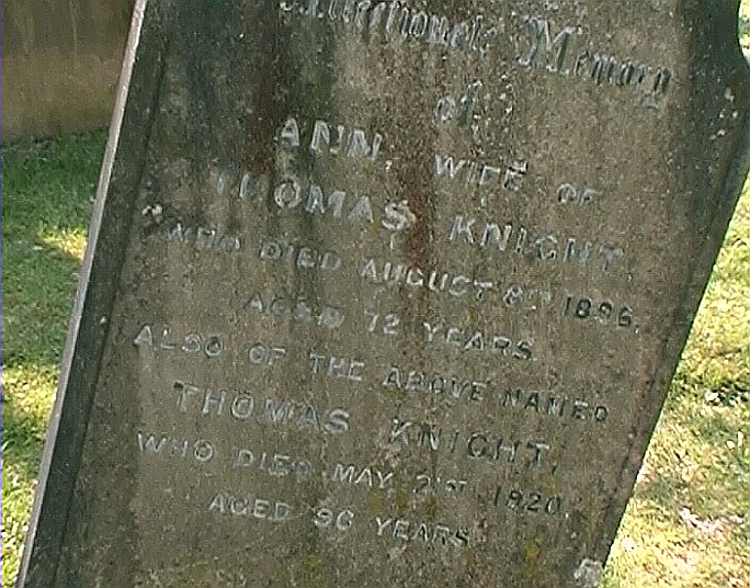 | In Affectionate Memory of ANN, wife of THOMAS KNIGHT who died August 3rd 1876 aged 72 years also of the above named THOMAS KNIGHT who died May 21st 1920 aged 96 years |