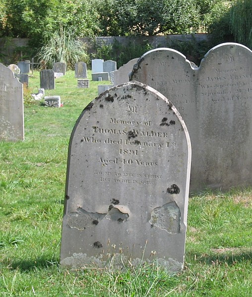 | In memory of THOMAS WALDER who died February 1st 1891 aged 40 To me to live is Christ But to die is to gain |