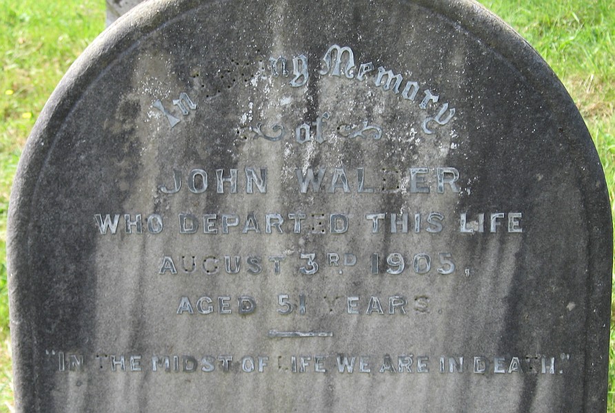| In loving memory of JOHN WALDER who departed this life Aug 3rd 1905 aged 51 yrs In the midst of life we are in death |
