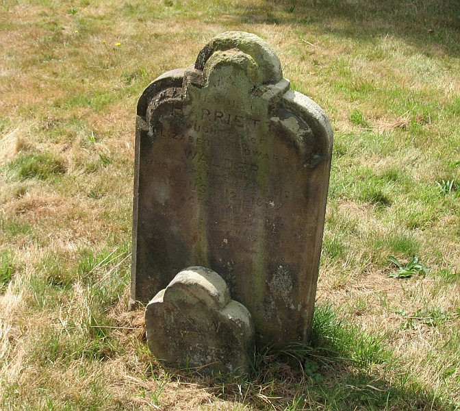 | In memory of HARRIETT daughter of ELIZABETH and EDWARD WALDER who departed this life August 12th 1867 Aged 8 years Suffer little children to come unto me and forbid them not. |